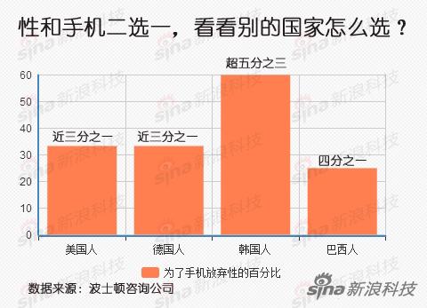 就性和手机二选一的问题而言,近三分之一的美国人表示,他们宁愿在一年内放弃性生活,而不是他们的智能手机。德国人也愿意像美国人那样,为了手机而放弃性。超过五分之三的韩国人也做了同样的选择。而只有四分之一的巴西人说自己愿意做出这样的选择。