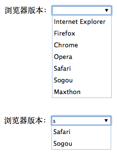 复制代码代码如下: <!DOCTYPE html> <html> <head> <title>HTML5 datalist tag</title> <meta charset="utf-8"> </head> <p> 浏览器版本:<input list="words"> </p> <datalist id="words"> <option value="Internet Explorer"> <option value="Firefox"> <option value="Chrome"> <option value="Opera"> <option value="Safari"> <option value="Sogou"> <option value="Maxthon"> </datalist> </body> </html>