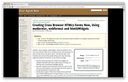 HTML5中的日历,取色板,滑块部件等都是非常棒工具,但是有些浏览器不支持。这个页面将帮助你构建完美的HTML5表单兼容方案。
