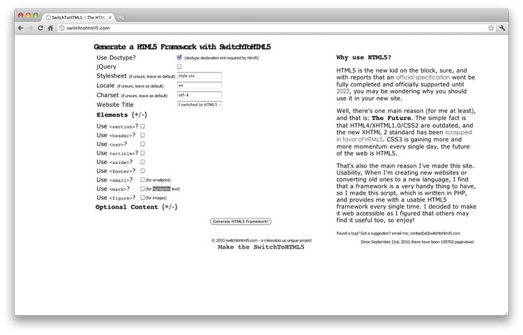 Switch To HTML5是一个基础而有效模板生成工具。如果你开始一个新项目,可以到这里获取免费的HTML5网站模板。