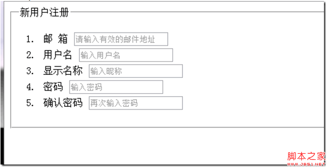 复制代码代码如下: <ol> <li> <label for="name">邮 箱</label> <input type="email" id="name" name="name" autofocus placeholder="请输入有效的邮件地址"> </li> <li> <label for="user"> 用户名</label> <input type="text" id="user" name="user" placeholder="输入用户名"> </li> <li> <label for="nickname"> 显示名称</label> <input type="text" id="nickname" name="user" placeholder="输入昵称"> </li> <li> <label for="password">密码</label> <input type="password" id="password" name="user_password" placeholder="输入密码"> </li> <li> <label for="confirm_password">确认密码</label> <input type="password" id="confirm_password" name="user_password" placeholder="再次输入密码"> </li> </ol>