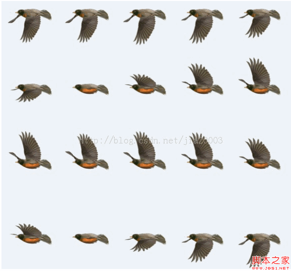 HTML5 Canvas动画效果演示 主要思想: 首先要准备一张有连续帧的图片,然后利用HTML5 Canvas的draw方法在不同的时间间隔绘制不同的帧,这样看起来就像动画在播放。 关键技术点: JavaScript 函数setTimeout()有两个参数,第一个是参数可以传递一个JavaScript方法, 另外一个参数代表间隔时间,单位为毫秒数。代码示例: setTimeout( update, 1000/30); Canvas的API-drawImage()方法,需要指定全部9个参数: ctx.drawImage(myImage, offw, offh, width,height, x2, y2, width, height); 其中offw, offh是指源图像的起始坐标点,width, height表示源图像的宽与高,x2,y2表 示源图像在目标Canvas上的起始坐标点。 一个22帧的大雁飞行图片实现的效果:
