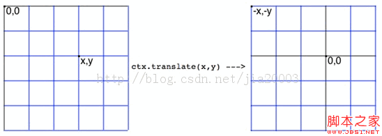 HTML5 Canvas中提供了实现图形平移,旋转,放缩的API。 平移(translate) 平移坐标translate(x, y)意思是把(0,0)坐标平移到(x, y),原来的(0,0)坐标则变成(-x, -y) 图示如下: