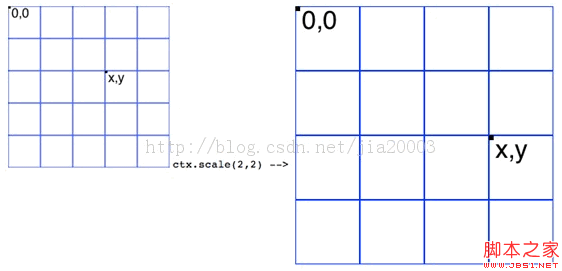 放缩(Scale) Scale(a, b)意思是将对象沿着XY轴分别放缩至a*x, b*y大小。效果如图示: