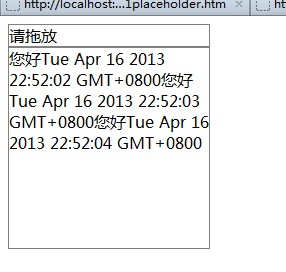 复制代码代码如下: <strong>拖放的例子 </strong> <!DOCTYPE html> <html xmlns="http://www.w3.org/1999/xhtml"> <head> <title></title> </head> <body> <div id="dragme" draggable="true" style=" width: 200px; border: 1px solid gray;">请拖放</div> <div id="text" style=" width: 200px; height: 200px; border: 1px solid gray;"></div> <script type="text/javascript"> document.ondragover = function (e) { e.preventDefault(); }; document.ondrop = function (e) { e.preventDefault(); }; var source = document.getElementById('dragme'); var dest = document.getElementById('text'); source.addEventListener('dragstart', function (e) { var dt = e.dataTransfer; dt.setData('text/plain', '您好' + new Date()); }, false); dest.addEventListener('dragend', function (e) { e.preventDefault(); }, false); dest.addEventListener('drop', function (e) { var dt = e.dataTransfer; var text = dt.getData('text/plain'); dest.innerHTML += text; e.stopPropagation(); e.preventDefault(); return false; }, false); </script> </body> </html>
