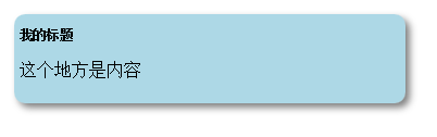 <style> article { background: lightblue; margin: 20px; padding: 5px; width: 350px; border-radius: 10px; box-shadow: 4px 4px 10px rgba(0, 0, 0, 0.5); } article h1 { font-size: 12px; } </style> <article> <header><h1>我的标题</h1></header> <p>这个地方是内容</p> </article>