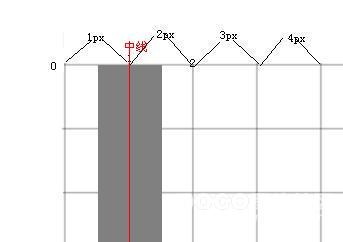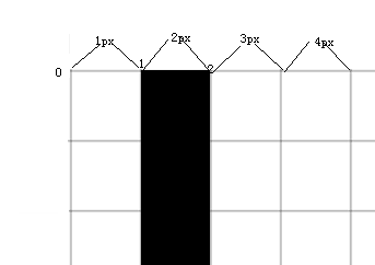 但遗憾的是canvas的线条画法不一样,上一篇文章我们已经说了,canvas的每条线都有一条无限细的“中线”,线条的宽度是从中线向两侧延伸的。如果我们还是从第2个像素点画一条线,那么线条的中线就会靠齐到第2个像素的起点,然后我们开始画了,问题也就来了:Canvas 的线条以中线向两侧延伸,而不是向某一边延伸(比如这里,如果只是往右侧延伸,那么我们的问题就不再是问题了),延伸过后我们的线条实际上是这样的: