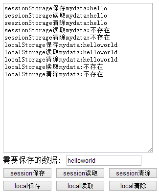 复制代码代码如下: <!DOCTYPE html> <html xmlns="http://www.w3.org/1999/xhtml"> <head> <meta http-equiv="Content-Type" content="text/html; charset=utf-8" /> <title></title> <style type="text/css"> textarea { width: 300px; height: 300px; } .button { width: 100px; } </style> </head> <body> <script type="text/javascript"> //使用HTML5 Web存储的localStorage和sessionStorage方式进行Web页面数据本地存储。 //页面参考如下图,能将页面上的数据进行本地存储。并能读取存储的数据显示在页面上。 function saveSession() { var t1 = document.getElementById("t1"); var t2 = document.getElementById("t2"); var mydata = t2.value; var oStorage = window.sessionStorage; oStorage.mydata = mydata; t1.value += "sessionStorage保存mydata:" + mydata + "\n"; } function readSession() { var t1 = document.getElementById("t1"); var oStorage = window.sessionStorage; var mydata = "不存在"; if (oStorage.mydata) { mydata = oStorage.mydata; } t1.value += "sessionStorage读取mydata:" + mydata + "\n"; } function cleanSession() { var t1 = document.getElementById("t1"); var oStorage = window.sessionStorage; var mydata = "不存在"; if (oStorage.mydata) { mydata = oStorage.mydata; } oStorage.removeItem("mydata"); t1.value += "sessionStorage清除mydata:" + mydata + "\n"; } function saveStorage() { var t1 = document.getElementById("t1"); var t2 = document.getElementById("t2"); var mydata = t2.value; var oStorage = window.localStorage; oStorage.mydata = mydata; t1.value += "localStorage保存mydata:" + mydata + "\n"; } function readStorage() { var t1 = document.getElementById("t1"); var oStorage = window.localStorage; var mydata = "不存在"; if (oStorage.mydata) { mydata = oStorage.mydata; } t1.value += "localStorage读取mydata:" + mydata + "\n"; } function cleanStorage() { var t1 = document.getElementById("t1"); var oStorage = window.localStorage; var mydata = "不存在"; if (oStorage.mydata) { mydata = oStorage.mydata; } oStorage.removeItem("mydata"); t1.value += "localStorage清除mydata:" + mydata + "\n"; } </script> <div> <textarea id="t1"></textarea> <label>需要保存的数据: </label> <input type="text" id="t2" /> <input type="button" class="button" onclick="saveSession()" name="b1" value="session保存" /> <input type="button" class="button" onclick="readSession()" value="session读取" /> <input type="button" class="button" onclick="cleanSession()" value="session清除" /> <input type="button" class="button" onclick="saveStorage()" value="local保存" /> <input type="button" class="button" onclick="readStorage()" value="local读取" /> <input type="button" class="button" onclick="cleanStorage()" value="local清除" /> </div> </body> </html>