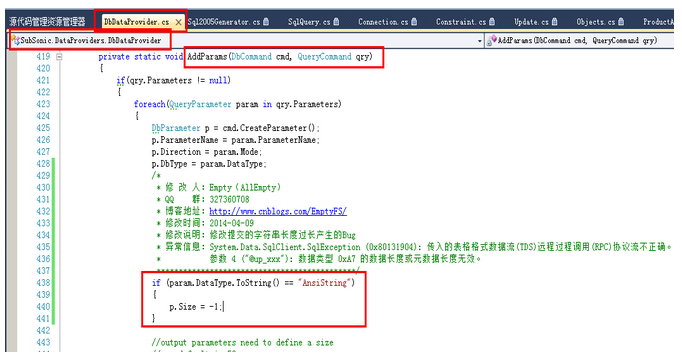 复制代码 代码如下: private static void AddParams(DbCommand cmd, QueryCommand qry) { if(qry.Parameters != null) { foreach(QueryParameter param in qry.Parameters) { DbParameter p = cmd.CreateParameter(); p.ParameterName = param.ParameterName; p.Direction = param.Mode; p.DbType = param.DataType; /* * 修 改 人:Empty(AllEmpty) * 修改说明:修改提交的字符串长度过长产生的Bug * 异常信息:System.Data.SqlClient.SqlException (0x80131904): 传入的表格格式数据流(TDS)远程过程调用(RPC)协议流不正确。 * 参数 4 ("@up_xxx"): 数据类型 0xA7 的数据长度或元数据长度无效。 *********************************************/ if (param.DataType.ToString() == "AnsiString") { p.Size = -1; }