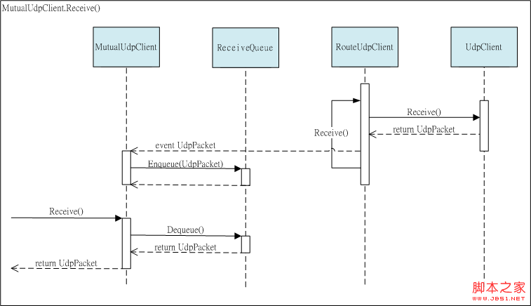 而MutualUdpClient对象在收到RouteUdpClient所提供的数据封包时,会先将数据封包暂存在一个队列里,并且在MutualUdpClient对象的Receive方法被呼叫时,再从队列取出数据封包并且回传给呼叫端,用以将远程设备传送的数据封包提供给呼叫端做后续的处理。经由这样的方式,每个系统中所建立的MutualUdpClient对象就可以透过Receive方法取得,每个远程设备传送的数据封包。