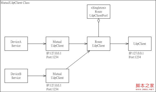 套用Singleton Pool模式解决了共享UdpClient联机的功能,接着在MutualUdpClient这个解决方案中,为了共享远程设备传送的数据封包,在UdpClient与MutualUdpClient之间加入了一个RouteUdpClient对象。
