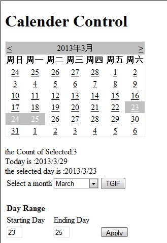 public partial class myTest_Calender : System.Web.UI.Page { protected void Page_Load(object sender, EventArgs e) { if (!IsPostBack) { my_Calendar.VisibleDate = my_Calendar.TodaysDate; //将选择的日期中的月份映射到下拉框中 Month_List.SelectedIndex = my_Calendar.VisibleDate.Month - 1; } //显示到标签中 lblTodaysDate.Text = "Today is :" + my_Calendar.TodaysDate.ToShortDateString(); } //选择一个日期的时候触发函数 protected void Calendar_Select(object sender, EventArgs e) { lblCountUpdate(); lblSelectedUpdate(); txtClear(); } //下拉框触发函数 protected void Month_SelectedChange(object sender, EventArgs e) { my_Calendar.SelectedDates.Clear(); lblSelectedUpdate(); lblCountUpdate(); //重新设置时间 my_Calendar.VisibleDate = new DateTime(my_Calendar.VisibleDate.Year, Int32.Parse(Month_List.SelectedItem.Value), 1); txtClear(); }