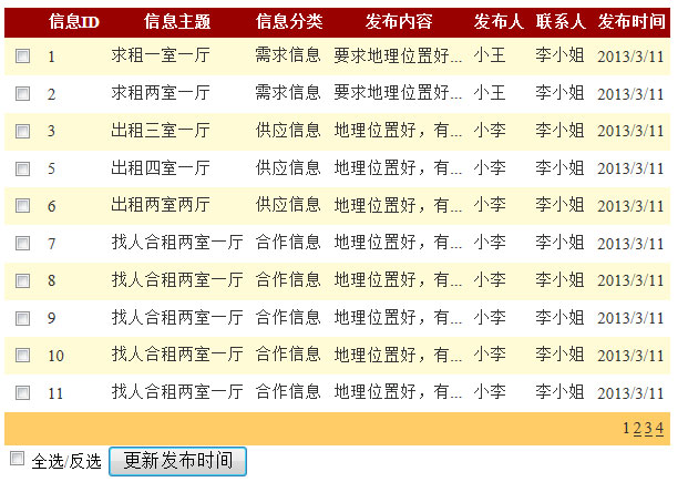 <html xmlns="http://www.w3.org/1999/xhtml" > <head runat="server"> <title>供求信息网审核发布信息</title> </head> <body class="Font"> <form id="form1" runat="server"> <div style="text-align: left" align="left"><asp:Panel ID="Panel2" runat="server"> <asp:GridView ID="GridView1" runat="server" AutoGenerateColumns="False" OnRowDataBound="GridView1_RowDataBound" OnSelectedIndexChanging="GridView1_SelectedIndexChanging" Font-Size="9pt" AllowPaging="True" EmptyDataText="没有相关数据可以显示!" OnPageIndexChanging="GridView1_PageIndexChanging" CellPadding="4" ForeColor="#333333" GridLines="None" DataKeyNames="id"> <Columns> <asp:TemplateField> <ItemTemplate> <asp:CheckBox ID="cbSingleOrMore" runat="server" /> </ItemTemplate> </asp:TemplateField> <asp:BoundField DataField="id" HeaderText="信息ID" /> <asp:BoundField DataField="name" HeaderText="信息主题" /> <asp:BoundField DataField="type" HeaderText="信息分类" /> <asp:BoundField DataField="content" HeaderText="发布内容" /> <asp:BoundField DataField="userName" HeaderText="发布人" /> <asp:BoundField DataField="lineMan" HeaderText="联系人" /> <asp:BoundField DataField="issueDate" HeaderText="发布时间" DataFormatString="{0:d}" /> </Columns> <FooterStyle BackColor="#990000" Font-Bold="True" ForeColor="White" /> <RowStyle BackColor="#FFFBD6" ForeColor="#333333" /> <SelectedRowStyle BackColor="#FFCC66" Font-Bold="True" ForeColor="Navy" /> <PagerStyle BackColor="#FFCC66" ForeColor="#333333" HorizontalAlign="Right" /> <HeaderStyle BackColor="#990000" Font-Bold="True" ForeColor="White" /> <AlternatingRowStyle BackColor="White" /> </asp:GridView> </asp:Panel> <asp:CheckBox ID="cbAll" runat="server" AutoPostBack="True" Font-Size="9pt" OnCheckedChanged="cbAll_CheckedChanged" Text="全选/反选" />