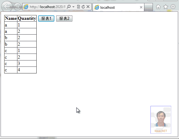接下来,完成第二个报表,在Insus.NET使用Repeater包含Repeater来实现。因此,前台Html代码如下,其中第一个Repeate内放置了一个HiddenField,来存储名称(Name)字段,当作子Repeater的参考传入。 复制代码 代码如下: View Code