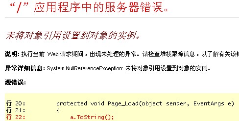 下面基础的解释一下这错误: 1:本质上的错误: 复制代码 代码如下: object a;//a是Null对象 protected void Page_Load(object sender, EventArgs e) { a.ToString();//调用一个Null对象的方法 } 当然啦!结果就如下图了: