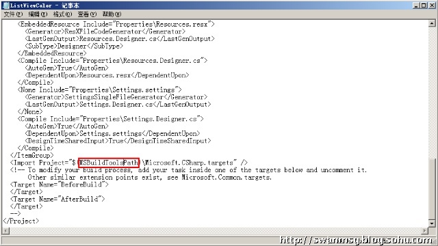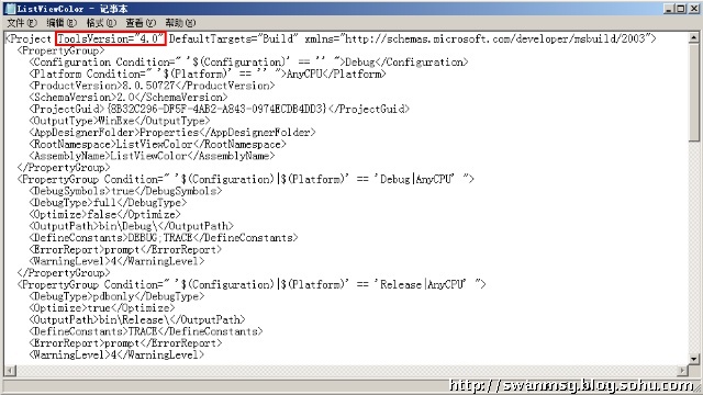 (2) 从vs2005项目转成vs2010项目,在ListViewColor工程文件中的第一行添加ToolsVersion="4.0",将MSBuildBinPath改为MSBuildToolsPath即可。