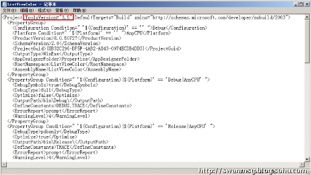 (2) 打开ListViewColor文件夹,用记事本打开ListViewColor工程文件。将第一行添加ToolsVersion="3.5",如图所示: