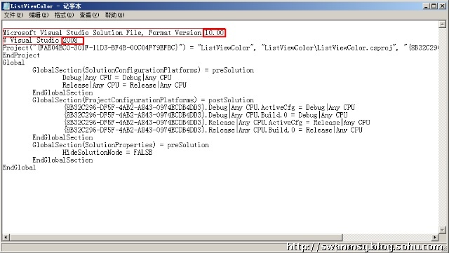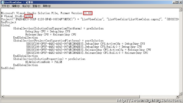 (1) 我们以上面用到的项目为例,用记事本打开ListViewColor解决方案文件,将版本号10.00改为11.00,将Visual Studio 2008改为Visual Studio 2010,如下图:
