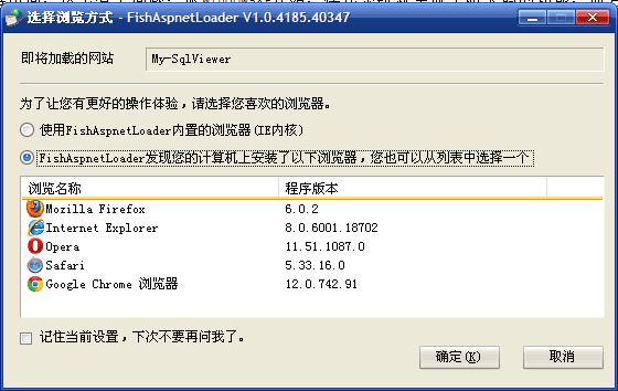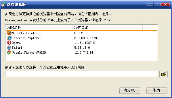 当您将一个目录加载为网站时,将会出现以下对话框,问您要选择什么样的浏览器来浏览网站:
