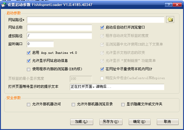 当您从“开始菜单”中启动FishAspnetLoader时,程序会显示“设置启动参数”对话框。