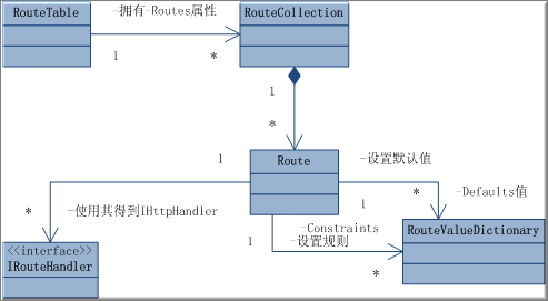 本文将分2部分介绍UrlRouting的使用分别为入门篇与进阶篇。 文章的前提: 1.安装Visual Studio 2008 sp1或其它IDE的等同版本。 2.建立一个Asp.net Web Application(Asp.net Web应用程序) 3.引用System.Web.Routing程序集。 UrlRouting的实现原理 如果你不是追求理论的人,仅仅是务实主义,可以直接从准备工作读起。 为了方便大家理解我绘制了一个UML图,其中通过RouteTable的Routes这个属性可以获取一个RouteCollection的Singleton模式,虽然在其中并没有判断值不存在时才初始化的Singleton的标志性行为,但是它是在Application_Start事件中进行初始化的,并且直到应用程序进程终结,所以是Singleton模式的。