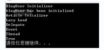 这种方式有助于提高于应用程序的性能,避免浪费计算,节省内存的使用等。针对于这种做法,似乎称之为即用即创建更为合适些。 先来看一下在Framework4.0中如何实现延迟加载。 Framework4.0提供了一个包装类 Lazy,可以轻松的实现延迟加载。 复制代码 代码如下: ///这行代码表明:要创建一个延迟加载的字符串对象s ///原型为LazyT> 对象名=new LazyT>(FunT>) ///采用泛型委托进行构造,实例化此委托时要求必须是返回值T类型的方法 ///如在本例中,T为string,则TestLazy.GetString方法的返回值必须也是string类型 Lazystring> s = new Lazystring>(TestLazy.GetString); 本例中TestLazy.GetString()方法如下示: public class TestLazy { public static string GetString() { return DateTime.Now.ToLongTimeString(); } } 可以通过IsValueCreated属性来确定对象是否已创建,通过Value属性来获取当前对象的值。 Console.WriteLine(s.IsValueCreated);//返回False Console.WriteLine(s.IsValueCreated);//返回True 下面经出完整代码,以供测试: 复制代码 代码如下: class Program { static void Main(string[] args) { ///这行代码表明:要创建一个延迟加载的字符串对象s ///原型为Lazy 对象名=new Lazy(Fun) ///采用泛型委托进行构造,实例化此委托时要求必须是返回值T类型的方法 ///如在本例中,T为string,则TestLazy.GetString方法的返回值必须也是string类型 Lazy s = new Lazy(TestLazy.GetString); Console.WriteLine(s.IsValueCreated);//返回False Console.WriteLine(s.IsValueCreated);//返回True } } public class TestLazy { public static string GetString() { return DateTime.Now.ToLongTimeString(); } } 下面再用一个例子,演示延迟加载: 在这个例子中,使用了BlogUser对象,该对象包含多个Article对象,当加载BlogUser对象时,Article对象并不加载,当需要使用Article对象时,才加载。 复制代码 代码如下: class Program { static void Main(string[] args) { BlogUser blogUser = new BlogUser(1); Console.WriteLine("blogUser has been initialized"); { Console.WriteLine(article.Title);} } } public class BlogUser { public int Id { get; private set; } public Lazy> Articles { get; private set; } public BlogUser(int id) { this.Id = id; Articles =new Lazy>(()=>ArticleServices.GetArticesByID(id)); Console.WriteLine("BlogUser Initializer"); } } public class Article { public int Id { get; set; } public string Title{get;set;} public DateTime PublishDate { get; set;} public class ArticleServices { public static List GetArticesByID(int blogUserID) { List articles = new List { new Article{Id=1,Title="Lazy Load",PublishDate=DateTime.Parse("2011-4-20")}, new Article{Id=2,Title="Delegate",PublishDate=DateTime.Parse("2011-4-21")}, new Article{Id=3,Title="Event",PublishDate=DateTime.Parse("2011-4-22")}, new Article{Id=4,Title="Thread",PublishDate=DateTime.Parse("2011-4-23} }; Console.WriteLine("Article Initalizer"); return articles; } } 运行结果如图示: