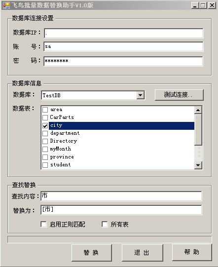 复制代码 代码如下: #region 执行批量替换操作 /// <summary> /// 执行批量替换操作 /// </summary> /// <param name="sender"></param> /// <param name="e"></param> private void ExecuteFilterBtn_Click(object sender, EventArgs e) { saveConfig(); total = 0; if (this.chkboxTableList.CheckedIndices.Count == 0) return; //没有选中任何表的情况 if (this.txtSearchKey.Text.Trim() == "") { DialogResult result = MessageBox.Show("当前查找内容为空,确认此操作?", "提示", MessageBoxButtons.YesNo, MessageBoxIcon.Question, MessageBoxDefaultButton.Button1); if (result == DialogResult.No) return; }