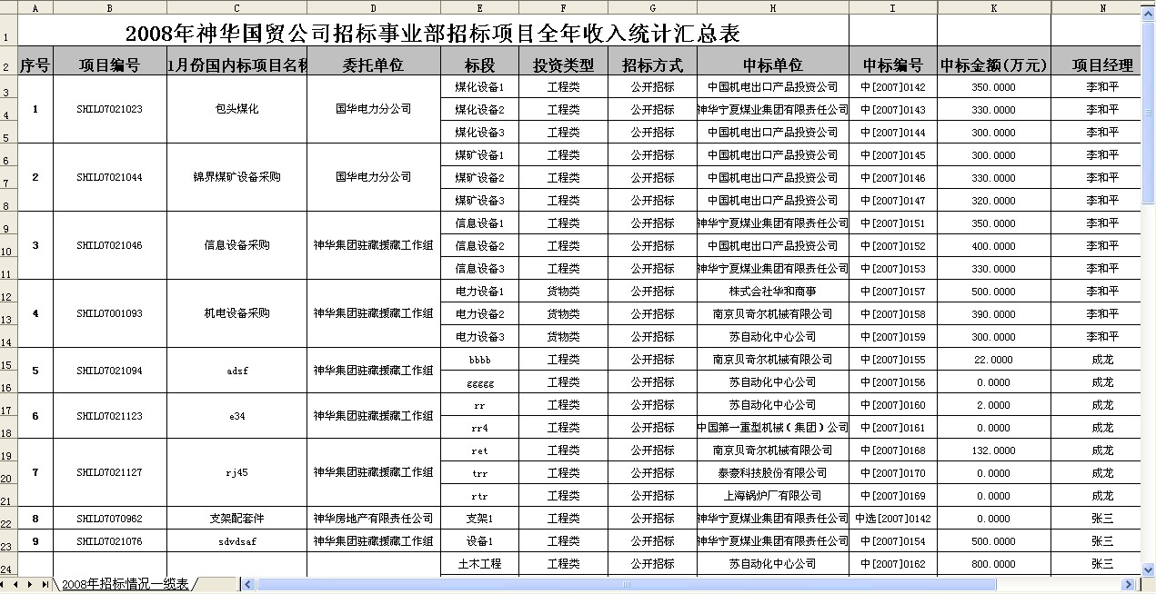 这个也是动态画的,用了个简单的模板,模板就一个表头,没多大意义,除非表头很复杂而且在列表中不需要重画,考虑模板就比较好,向上面那个一月份国际的和其它月份的都是需要重画表头的。至于合并,如果不是嵌套的合并,我们可以在向模板循环写数据的时候直接控制,比如下面一个简单的写法: 复制代码 代码如下: for (i = 0; i < table.Rows.Count; i++) { bidName = table.Rows[index]["BIDNAME"].ToString(); if (table.Rows[i]["BIDNAME"].ToString() == bidName) { projNum++; worksheet.Cells[5 + i, 2] = table.Rows[i]["PROJNO"]; worksheet.Cells[5 + i, 3] = table.Rows[i]["PROJNAME"]; worksheet.Cells[5 + i, 4] = table.Rows[i]["STAT_DATE"]; worksheet.Cells[5 + i, 5] = table.Rows[i]["PROJTYPE"]; worksheet.Cells[5 + i, 6] = table.Rows[i]["CONTENT"]; worksheet.Cells[5 + i, 7] = table.Rows[i]["OPENDT"]; worksheet.Cells[5 + i, 8] = table.Rows[i]["OPENADDRESS"]; worksheet.Cells[5 + i, 9] = table.Rows[i]["REV_DATE"]; worksheet.Cells[5 + i, 10] = table.Rows[i]["BID_UNIT"]; worksheet.Cells[5 + i, 11] = table.Rows[i]["AGT_AMOUNT"]; worksheet.Cells[5 + i, 12] = table.Rows[i]["CURRENCY"] + ":" + table.Rows[i]["BIDSER_AMOUNT"]; worksheet.Cells[5 + i, 13] = table.Rows[i]["SENDDATE"]; worksheet.Cells[5 + i, 14] = table.Rows[i]["CURRENCY"] + ":" + table.Rows[i]["BIDPRICE"]; worksheet.Cells[5 + i, 15] = table.Rows[i]["BOOKAMOUNT"]; worksheet.Cells[5 + i, 16] = table.Rows[i]["CURRENCY"] + ":" + table.Rows[i]["BAIL_AMOUNT"]; worksheet.Cells[5 + i, 17] = table.Rows[i]["USERNAME"]; worksheet.Cells[5 + i, 18] = table.Rows[i]["SECOND_USER"]; worksheet.Cells[5 + i, 19] = ""; worksheet.get_Range(worksheet.Cells[5 + i, 1], worksheet.Cells[5 + i, 19]).Borders.Color = System.Drawing.ColorTranslator.ToOle(System.Drawing.Color.Black); continue; }
