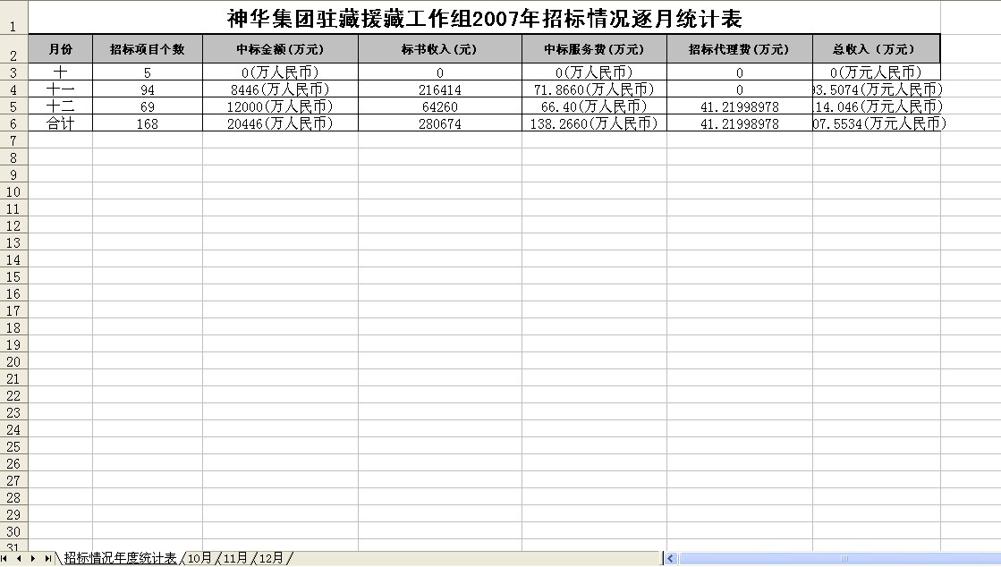 绘制这张表的要求是根据选择某年的几月到几月,生成这个几个月的一个综合情况的sheet,然后分别生成这几个月的单独的sheet表,生成上面表的模板,包含两个sheet ,一个综合月份的sheet和一个单独月份的sheet,因为单独月份的sheet表现形式都是一样的,我们可以根据选择的月份个数Copy几个sheet就可以了 复制代码 代码如下: Workbooks workbooks = app.Workbooks; _Workbook workbook = workbooks.Add(template_path + "\\招标单位年度招标情况逐月统计表.xls"); Sheets sheets = workbook.Worksheets; _Worksheet Yearsheet = (_Worksheet)sheets.get_Item(1); _Worksheet worksheet = (_Worksheet)sheets.get_Item(2); if (worksheet == null) { return; } for (int i = 1; i < monthCount; i++) worksheet.Copy(Missing.Value, workbook.Worksheets[2]);//月统计工作薄 Yearsheet的操作就不说了,和前面几个一样操作,关键是月份的sheet的生成,其实就是循环操作get_Item(i),代码如下 复制代码 代码如下: //////////////////////////////////////每月详细统计//////////////////////////////////// int item_id = 2; rowNum = 0; book_Amount = 0; index = 0; bid_Amount = ""; bidser_Amount = ""; agent_Amount = 0;//清空变量 _Worksheet ws = null; for (int i = 0; i < tableMM.Rows.Count; i++) { rowNum++; Month = tableMM.Rows[index]["DATE_MONTH"].ToString(); if (tableMM.Rows[i]["DATE_MONTH"].ToString() == Month) { ws = (_Worksheet)sheets.get_Item(item_id); ws.Cells[3 + rowNum - 1, 1] = rowNum; ws.Cells[3 + rowNum - 1, 2] = tableMM.Rows[i]["PROJNO"]; ws.Cells[3 + rowNum - 1, 3] = tableMM.Rows[i]["PROJNAME"]; ws.Cells[3 + rowNum - 1, 4] = tableMM.Rows[i]["BID_TYPE"]; ws.Cells[3 + rowNum - 1, 5] = tableMM.Rows[i]["BID_MODE"]; ws.Cells[3 + rowNum - 1, 6] = tableMM.Rows[i]["OPENDT"]; ws.Cells[3 + rowNum - 1, 7] = tableMM.Rows[i]["OPENADDRESS"]; ws.Cells[3 + rowNum - 1, 8] = tableMM.Rows[i]["BID_UNIT"]; ws.Cells[3 + rowNum - 1, 9] = tableMM.Rows[i]["NOTICE_NO"].ToString().Replace("神华国贸", ""); ws.Cells[3 + rowNum - 1, 10] = tableMM.Rows[i]["BOOKAMOUNT"]; ws.Cells[3 + rowNum - 1, 11] = tableMM.Rows[i]["BIDPRICE"] + "(万" + tableMM.Rows[i]["CURRENCY"] + ")"; ws.Cells[3 + rowNum - 1, 12] = tableMM.Rows[i]["BIDSER_AMOUNT"] + "(万" + tableMM.Rows[i]["CURRENCY"]+")"; ws.Cells[3 + rowNum - 1, 13] = tableMM.Rows[i]["AGT_AMOUNT"]; ws.Cells[3 + rowNum - 1, 14] = ""; ws.get_Range(ws.Cells[3 + rowNum - 1, 1], ws.Cells[3 + rowNum - 1, 14]).Borders.Color = System.Drawing.ColorTranslator.ToOle(System.Drawing.Color.Black); continue; } ws.Cells[1, 1] = year + "年" + bidName + GetMonth(Month) + "月份招标项目情况一览表"; //每月合计 sql = " SELECT CURRENCY, NVL(SUM(BIDPRICE),0) AS BIDPRICE,NVL(SUM(BOOKAMOUNT),0) AS BOOKAMOUNT,NVL(SUM(BIDSER_AMOUNT),0) AS BIDSER_AMOUNT,NVL(SUM(AGT_AMOUNT),0) AS AGT_AMOUNT FROM IBS_V_BID_MONTHLY_STAT" + SqlFilter + " AND DATE_YEAR ='" + year + "' AND COMPANY_ID=" + biderID + " AND DATE_MONTH ='" + Month + "'" + " GROUP BY CURRENCY"; System.Data.DataTable dt1 = OracleHelper.RetDataTable(sql); for (int m = 0; m < dt1.Rows.Count; m++) { bid_Amount += dt1.Rows[m]["BIDPRICE"] + "(万"+dt1.Rows[m]["CURRENCY"] + ")\r\t"; book_Amount += float.Parse(dt1.Rows[m]["BOOKAMOUNT"].ToString()); bidser_Amount += dt1.Rows[m]["BIDSER_AMOUNT"] + "(万" + dt1.Rows[m]["CURRENCY"] + ")\r\t"; agent_Amount += float.Parse(dt1.Rows[m]["AGT_AMOUNT"].ToString()); } ws.Cells[3 + rowNum - 1, 3] = "合 计"; ws.Cells[3 + rowNum - 1, 10] = book_Amount; ws.Cells[3 + rowNum - 1, 11] = bid_Amount; ws.Cells[3 + rowNum - 1, 12] = bidser_Amount; ws.Cells[3 + rowNum - 1, 13] = agent_Amount; ws.get_Range(ws.Cells[3 + rowNum - 1, 1], ws.Cells[3 + rowNum - 1, 14]).Borders.Color = System.Drawing.ColorTranslator.ToOle(System.Drawing.Color.Black); ws.Name = GetMM(Month); item_id++; index = i; //汇总下一个月份的招标项目 i--; rowNum = 0; book_Amount = 0; bid_Amount = ""; bidser_Amount = ""; agent_Amount = 0;//清空变量 } //跳出循环时进行最后一个月份的项目汇总 用的是oracle数据库,所以上面那个sql语句。。。 呵呵 ============================================================================================ 上面大致说得就差不多了,因为是不断循环的什么的,可能对于大的数据量读写来说,比较好性能,如果大家有什么更好的方法,可以指点下,为了弥补等待时间过长,所以才结合了AJAX来处理。 最后我把做的一个小demo的链接帖出来给大家,还有一些空模板和对应生成的数据表给大家对照看下,尤其相对复杂一些的表画应该是能画出来的,主要看大家采用什么样的方法,能少循环一次就尽量少循环,呵呵~~~ EXCEL模板读写说明 http://www.justlike.com.cn/upfiles/template_xls.rar http://www.justlike.com.cn/upfiles/ExcelFiles.rar http://www.justlike.com.cn/upfiles/ExcelReportDemo.rar (说明:最后弹出下载文件的一个页面一直想让其自动关掉,但是不行,如果不关掉,再点导出,不会弹出下载框,实际的处理中我们可以在导出旁边放个下载按钮,就像上面的效果图里那样,当然可以点导出的时候让其在网页中直接打开,点下载的时候再弹出下载框,但是直接打开的话,文件需要生成在虚拟目录下,不太安全,呵呵~~,看实际情况处理了) ========================================================================================== 今天补充说明下,关于那个调用ajax回调的效果,有个地方用到了所谓的“ajax嵌套调用”,如下
