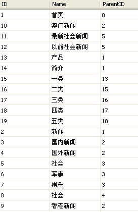 先看看数据库表的设计,数据表主要包括ID,Name,ParentID这三项,其中ID是主键,ParentID对应节点的父节点: