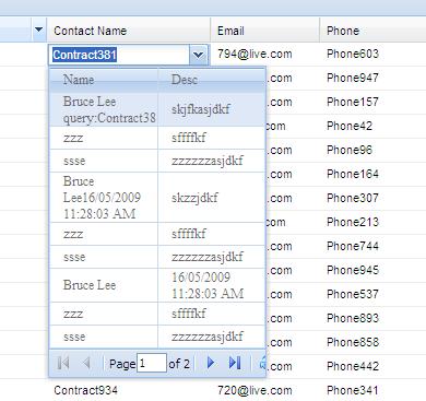 关键代码: 复制代码 代码如下: <ext:Column ColumnID="ContactName" DataIndex="ContactName" Header="Contact Name" Width="150"> <Editor> <ext:ComboBox ID="ComboBox1" runat="server" StoreID="stoContactName" DisplayField="Name" ValueField="Name" TypeAhead="false" LoadingText="Searching..." Width="570" PageSize="10" Editable="true" Mode="Remote" MinListWidth="200" ItemSelector="tr.search-item" MinChars="1" MsgTarget="Side" TriggerAction="All" Grow="true"> <CustomConfig> <ext:ConfigItem Name="tpl" Value="#{TplContactName}" Mode="Raw" /> </CustomConfig> </ext:ComboBox> </Editor> </ext:Column>