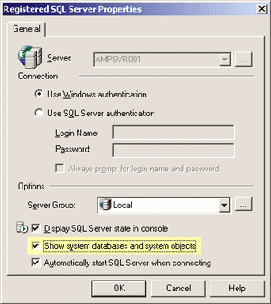 了解通过修改注册服务器的属性,SQL Server 企业管理器能使你查看系统表是非常有用的,如 Figure 2 所示。如果你在企业管理器中右键单击服务器名字,并选择“Edit SQL Server Registration properties”,将弹出一个对话框。在对话框的下面,你可以看到一个标有“Show system databases and system objects”的复选框。选中这个选项便打开了系统对象视图,也可以选择关闭来使表的视图看起来更简单和更易读。