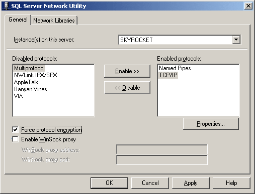 为了能够使用加密。用户和服务器都应该使用TCP/IP NetworkLibraries用来连接。运行适当的Network Utility和检查Force protocol encryption,看下表,用户和服务器之间的连接将不会被加密。