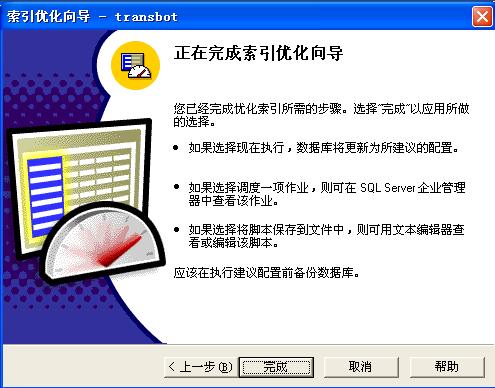 在此过程中,SQL Server的性能会受到严重影响,所以在操纵这些选项时,要特别注意你的工作环境。例如,如果你有一个生产型OLTP数据库,但日志记录到一个OLAP服务器,那么应该针对OLAP数据库来运行向导,再将建议的更改应用于这两个系统。