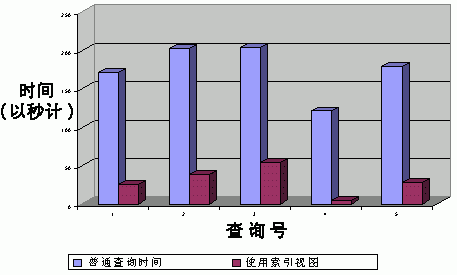 下图说明了查询优化器使用索引视图时一般能够提高多少性能。提供的查询复杂程度各不相同(例如,聚合计算的数量、所用表的数量或谓词数),并包括来自实际生产环境的数百万行的大表。