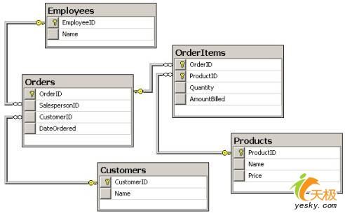对于本文中的示例,我们将使用一个含有产品、销售人员(雇员)、顾客和订单信息的数据库。我们使用五个表来建模:Customers,Employees,Products,Orders和OrderItems。其中,Customers,Employees和Products表分别包含每一个顾客,雇员和产品信息的行记录数据。每当一个顾客进行购买活动,一条新记录被添加到Orders表中,其中的信息指示该顾客实现了购买、该雇员进行的这一销售活动及订单的日期。其中,OrderItems映射订单中的每一件产品,产品的数量和价格总值(假定较大的购买量可以打折)。下图展示了这些表(及字段)以及它们之间的关系。