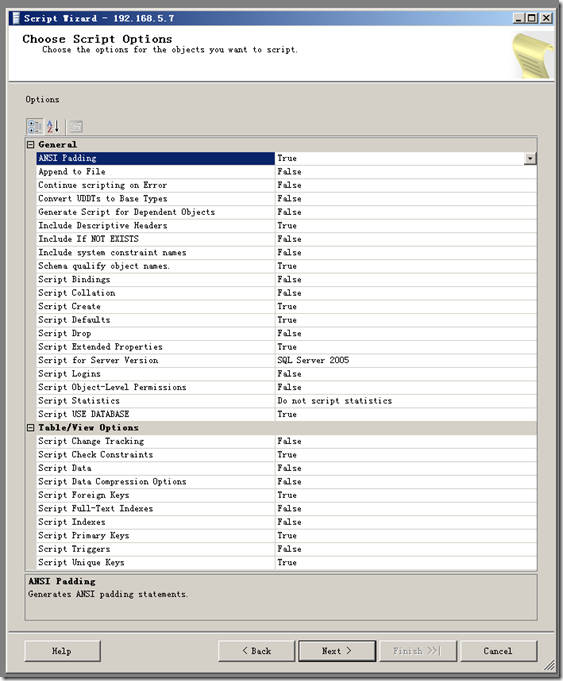 SQL Server 2005 的生成 SQL Server 脚本向导(“选择脚本选项”页)