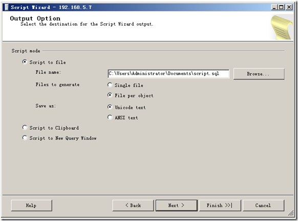 这里可以方便的选择以 Unicode 或“ANSI 文本”格式将脚本生成到 .sql 文件中。