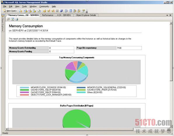 除了 Performance Studio 提供的性能面板报告外,SQL Server Management Studio 还包括大量的服务器级和数据库级标准报告,可用于查看性能统计和实时活动。可以利用这些报告疑难解答由于资源消耗过大或并行性导致的性能问题。图5显示了“内存占用”标准报告。