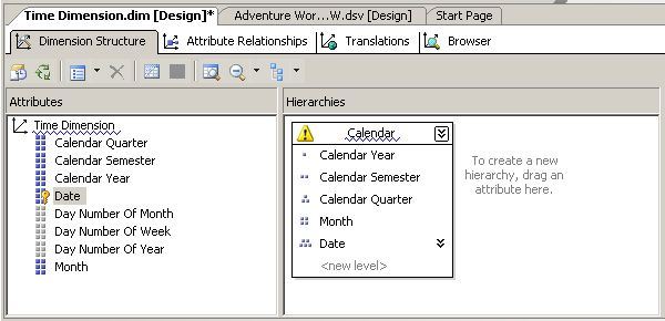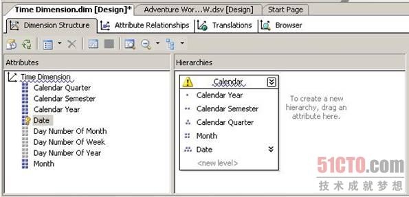 早期开发阶段的设计效率低下往往会浪费大量开发时间,因为开发人员已经完成的工作是以不正确的设计为基础的,因此在修正错误后,需要重新设计。SQL Server 2008 Analysis Services 新引进了一套创新的 Best Practice Design Alerts(最佳实践设计警报),可在开发流程的早期阶段对潜在的设计问题自动发出通知,这会减少由于设计错误导致的时间浪费,并有利于实施更快的开发流程。图1显示了针对 Time 维度和 Calendar 层次结构的警报。在图1中可以看到,警报突出显示了问题区域,但它们不会以任何方式影响功能,可以简单地忽略或关闭单个或全部警报。