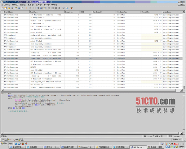 点击”运行” 后,系统进入检测页面,待SQL server profiler运行了一段时间后,将其检测结果保存为trc文件,这个时候,就可以就具体的性能问题着手进行定位分析了,通过trc文件我们发现,Duration出现值大于1000的多次出现,且objectType一般为P(即Stored Procedure类型),由于该web应用访问数据库主体的业务逻辑主体是通过Stored Procedure运行的,通过该文件已经能够实施”精确”方案了,很显然,下一步计划应该是调整表的索引和索引碎片了。