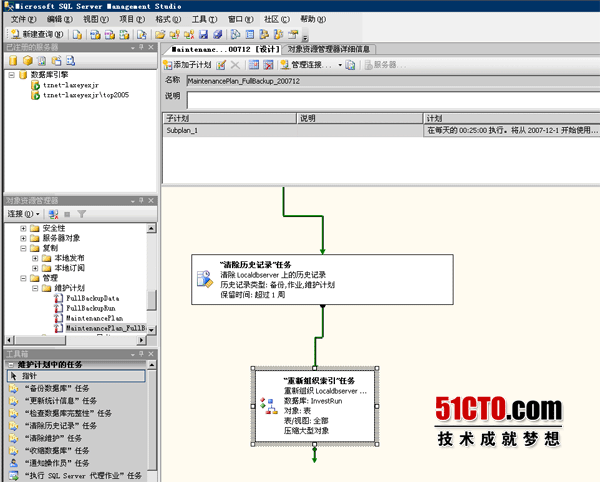 选择了要分析负荷trc文件后,点击”开始分析”,一段时间后它将给你优化报告,可以择其善者而从之。笔者通过一番比较和研究发现它给出的一些索引和信息重建确实比较合理,故在SQL server management studio 中执行了这些重建索引和静态信息的语句,执行之后,效果比较明显,SQL SERVER 2005的CPU占用率已经回落到平均50%^左右了。此时,夹在心里的一块石头算是落地了,但是革命尚未成功,同志仍须努力,紧接着笔者继续调整了很多重要大表的索引和静态信息计划的重建,并且对索引碎片也进行了重新组织,并且更改了备份计划,让每天备份完成后自动进行索引碎片重新组织的任务,如下图: